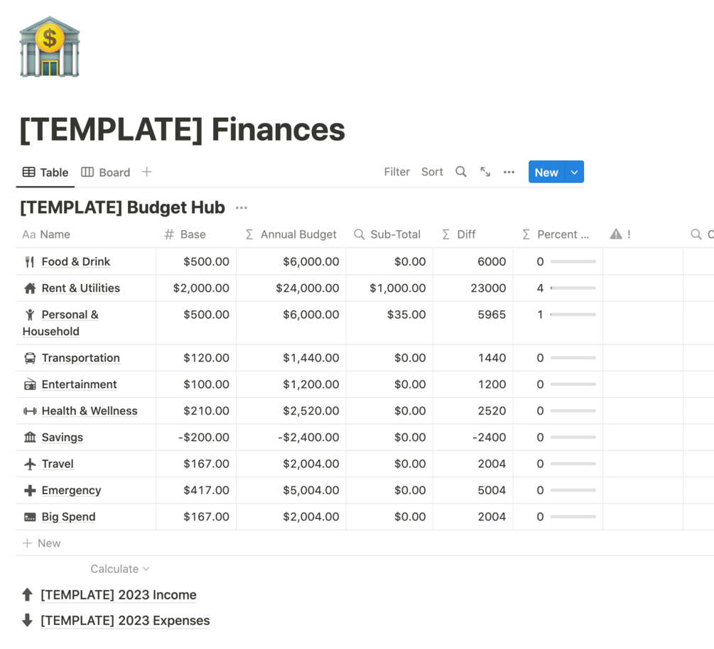 This template is designed to work with Mint or another transaction database. If you can import each transaction, this page will help you to sort by spending category and month. Set a base budget in the "Budget Hub", and from there, each month's budget will increase or decrease depending on the difference between your budgets and your actuals. You can also see an annual view of your spending by category.